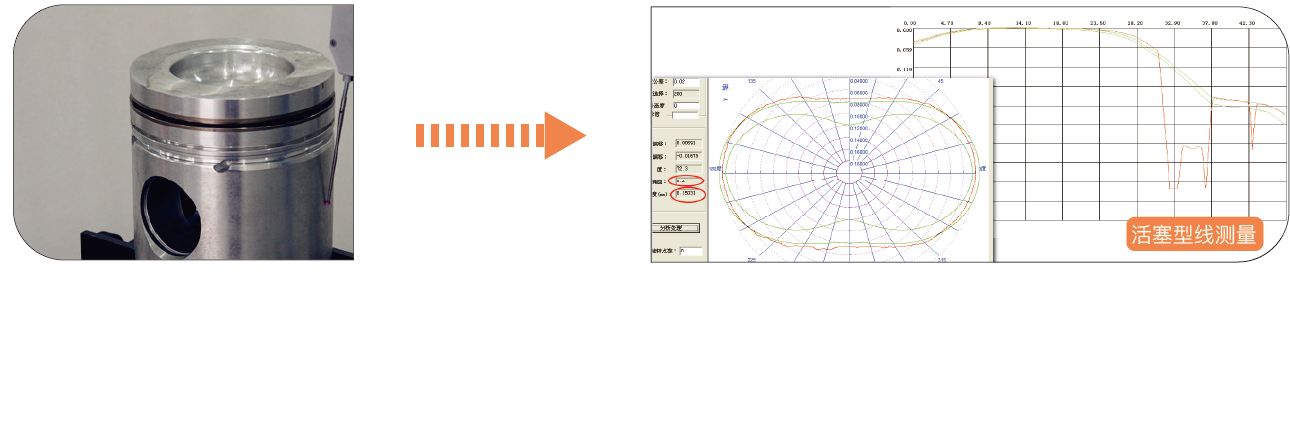 ● 配置活塞型線測(cè)量及橢圓截面測(cè)量測(cè)量軟件包,測(cè)量出活塞截面升程、型線曲線及橢圓度