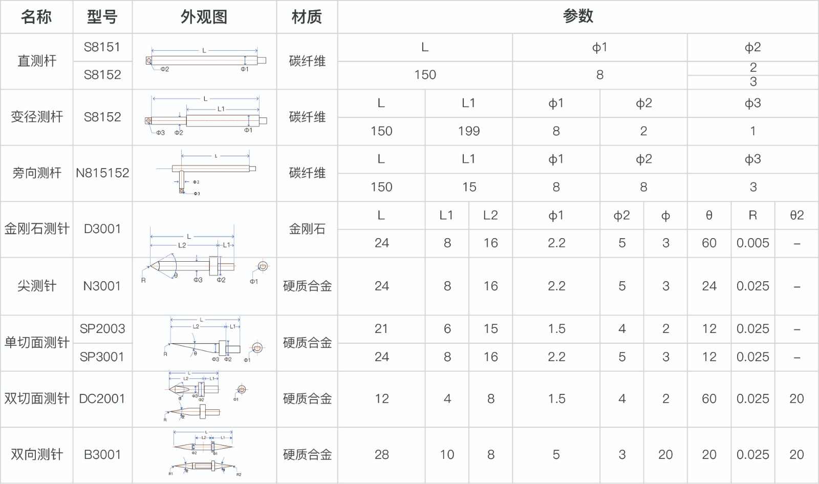 主要參數(shù):測(cè)針、測(cè)桿、工裝夾具